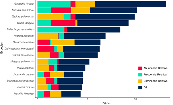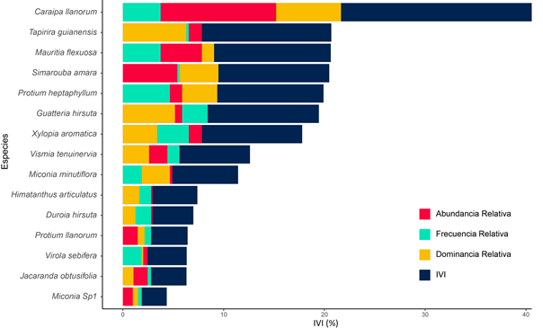 La especie con mayor IVI en el corredor occidental de bosque de galería fue Caraipa llanorum (Figura 6), que, a su vez, obtuvo el mayor valor de abundancia relativa y de dominancia relativa, siendo la que aportó mayor número de individuos y volumen de biomasa de madera en este sector. Otras especies con valores altos de IVI fueron Tapirira guianensis, Mauritia flexuosa, Simarouba amara y Protium heptaphyllum.