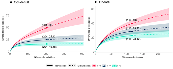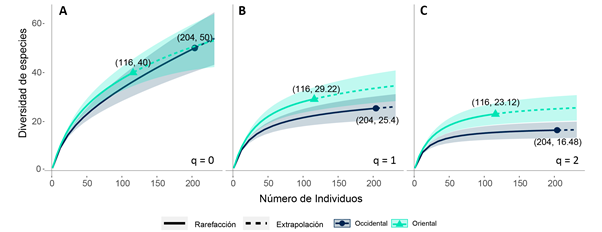 En el muestreo se encontró que los porcentajes están muy cercanos entre el corredor occidental y el oriental, con 86 % y 85 %, respectivamente, que fue representativo en ambos corredores, con intervalos de confianza de 95 % y sin diferencias significativas en la cobertura de la muestra en ambos corredores. Aunque el corredor occidental registró mayor número de individuos con respecto al oriental (Figura 2), esta diferencia no afectó el porcentaje de cobertura del muestreo en el corredor oriental. En el comportamiento de la curva, la extrapolación en el corredor occidental mostró tendencia a la asíntota en contraste con el corredor oriental. La curva aumentó en la extrapolación en q = 0 en ambos corredores, lo que indica que hacen falta especies por registrar. La diversidad en los valores de q = 1 y 2 del corredor oriental fue más alta en términos de especies efectivas que en el corredor occidental, aunque no se encontraron diferencias significativas en q = 1 (Figura 9B), pero sí en q = 2 (Figura 9C). En general, se obtuvo una alta representatividad de especies con el muestreo realizado.