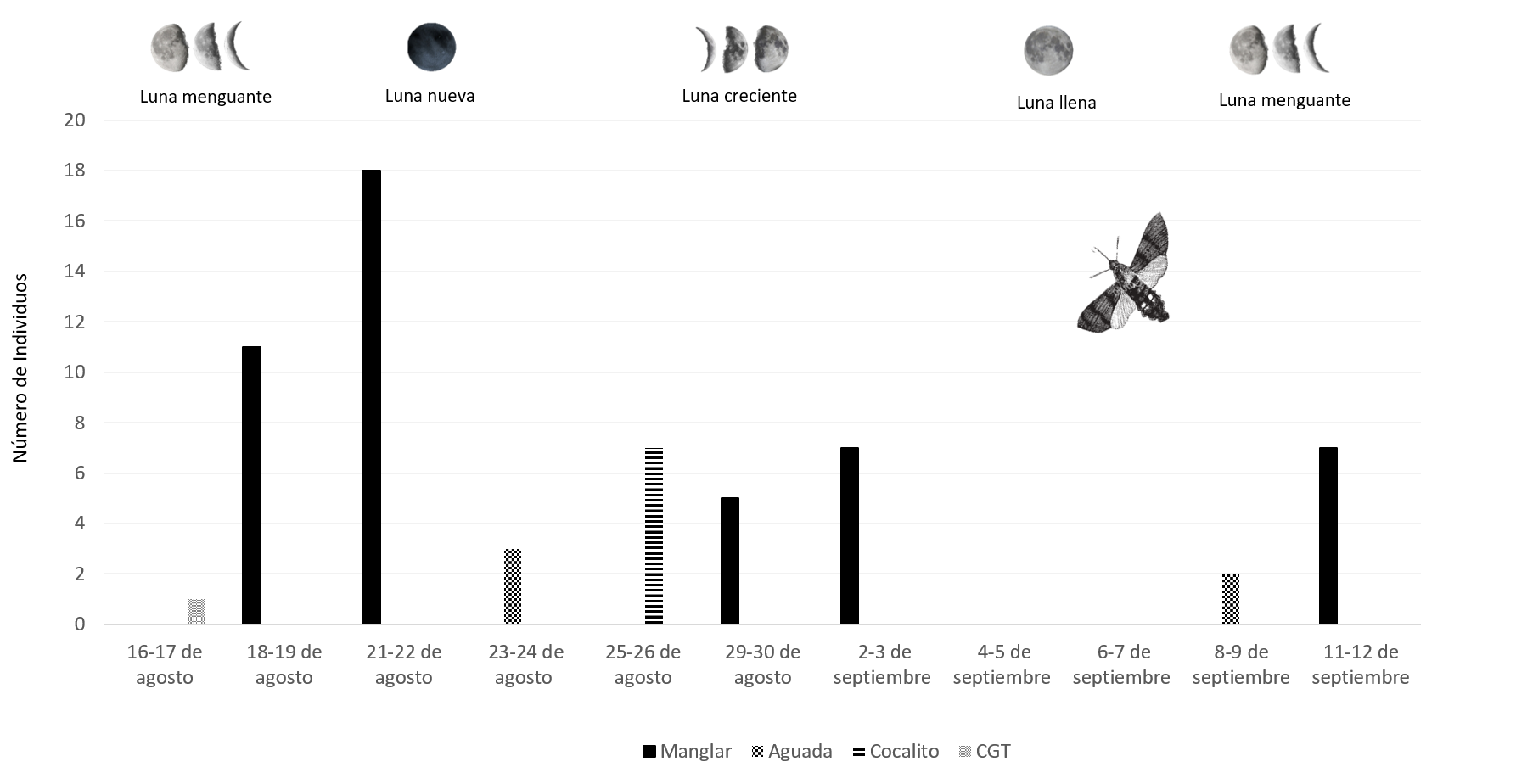 Al compararse el número de individuos recolectados en la trampa de luz en las diferentes localidades y fases lunares evaluadas, se corrobora la hipótesis de la fobia lunar, propuesta por Janzen (1984). Este autor explica que las polillas vuelan en línea recta con un ángulo constante teniendo un punto de referencia y orientación, como la luna y las estrellas. Si en una noche de luna nueva se pone un bombillo en mitad del bosque, la polilla usará esa luz como punto de referencia, donde su vuelo que va en un ángulo constante se convertirá en una espiral y terminará por llegar a la trampa. Por el contrario, en una noche de luna llena, la trampa de luz no tendrá ningún efecto en la orientación y vuelo de las polillas, pues se ha demostrado que los esfíngidos acortan su actividad y el número de satúrnidos que llega a las trampas se ve disminuido (Janzen, 1984). En el PNN Utría, el mejor muestreo del mes se obtuvo durante la luna nueva, con 18 individuos recolectados, mientras que en los muestreos con luna llena no se capturaron especímenes (Figura 5). Sin embargo, Nowinszky et al. (2010) proponen una nueva hipótesis en la que plantean que la disminución en la actividad de las polillas y la iluminación lunar se debe a una relación entre el ciclo de vida de cada especie y las fases de la luna, razón por la cuál es de importancia conocer los ciclos de vida para cada especie.