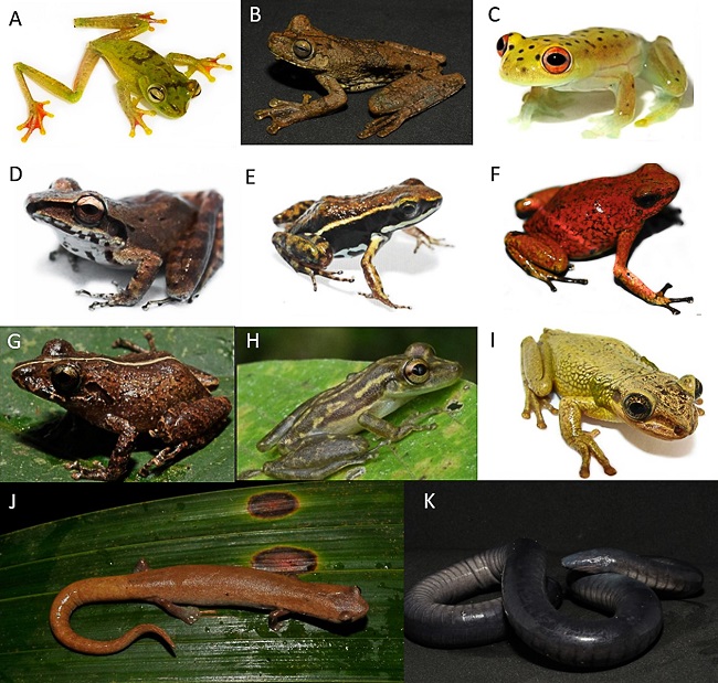 Figure 2: Some of the amphibian species reported in Tumaco and Francisco Pizarro, Nariño, Colombia. A, Boana pellucens; B, Boana rosenbergi; C, Cochranella litoralis; D, Craugastor longirostris; E, Epipedobates boulengeri; F, Oophaga sylvatica; G, Pristimantis walkeri; H, Scinax tsachila; I, Trachycephalus jordani; J, Bolitoglossa biseriata; K, Caecilia guntheri.