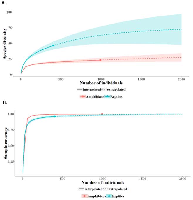 According to our data, we estimated that up to 111 species, around 36 amphibians and 75 reptiles, can be found with a greater sampling effort when sampling coverage higher than 99 % is reached (Figure 5A).In amphibians, with 991 individuals, we obtained a sampling coverage of 98 %, and in reptiles, with 401 individuals, we found a sampling coverage of 95 % (Figure 5B). This inventory has shown slightly better richness results for amphibians than reptiles.