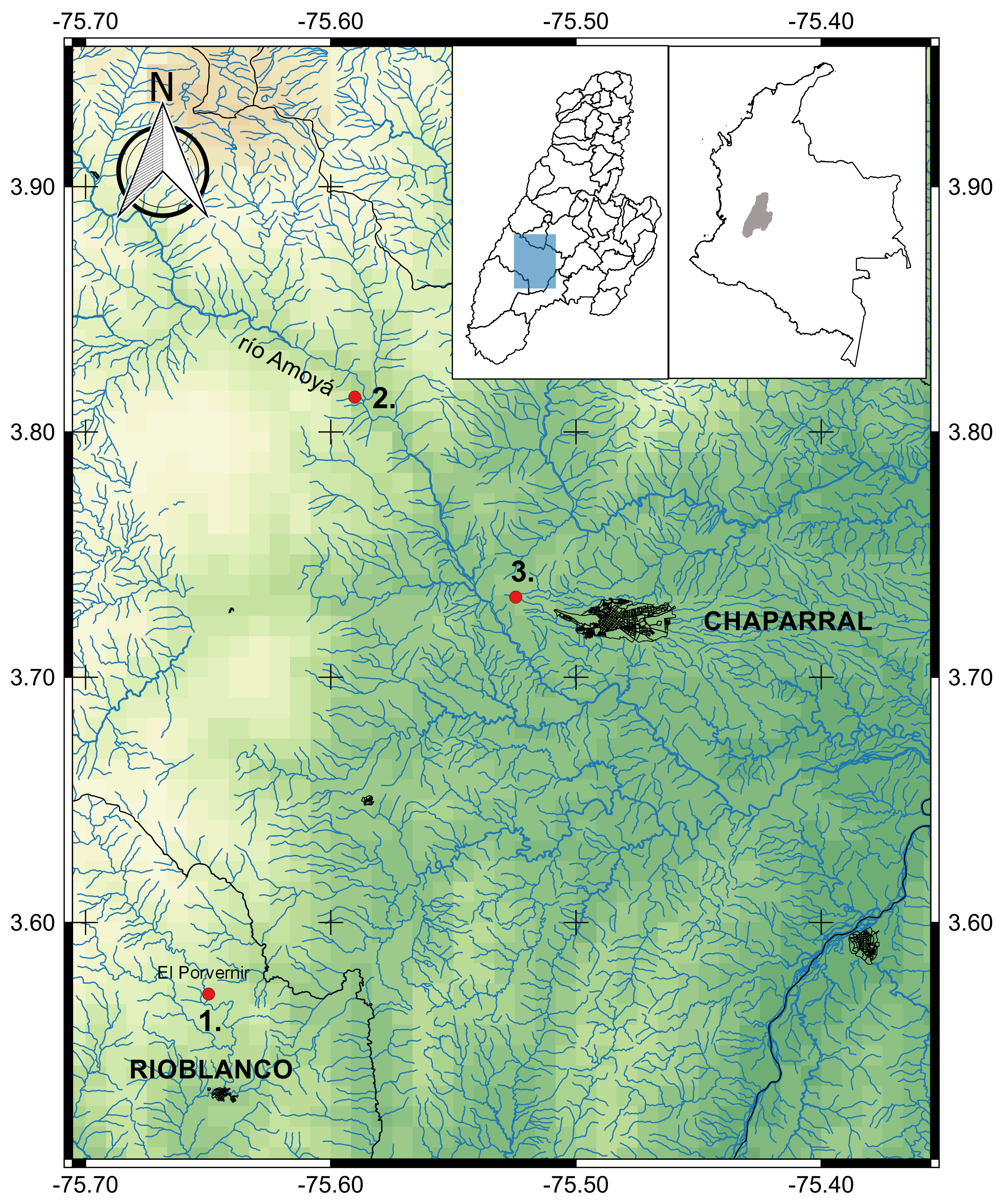 Figura 1: Localidades con registros de Corapipo leucorrhoa en el sur del alto valle del río Magdalena, Colombia. 1, Vereda El Porvenir (Rioblanco, Tolima); 2, Vereda Vega Chiquita (Chaparral, Tolima); 3, periferia del casco urbano de Chaparral.