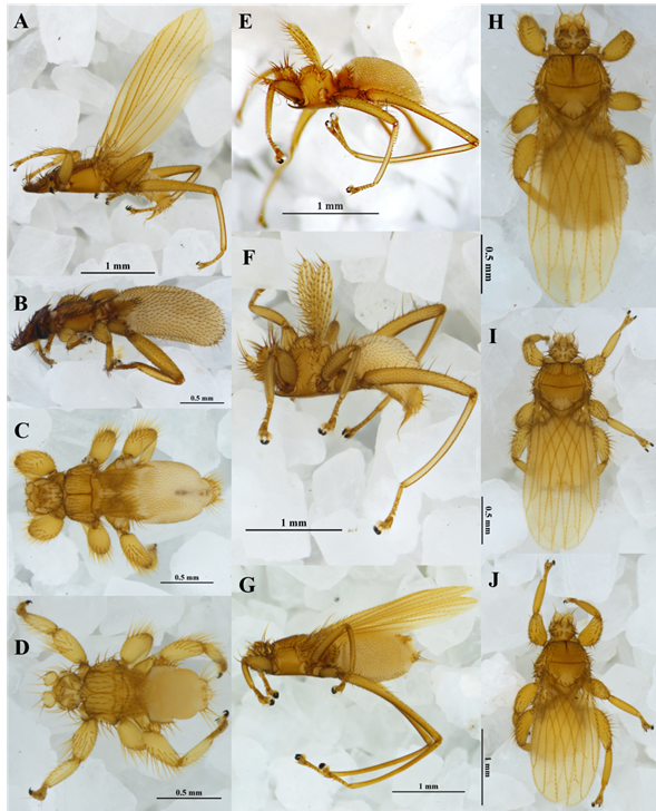 Figure 1: Species of Streblidae occurring in dry forest in vereda El Carbonero (Santander de Quilichao, Cauca, Colombia). Streblinae: A, Anastrebla modestini; B, Metelasmus pseudopterus. Trichobiinae: C, Aspidoptera delatorrei; D, Exastinion clovisi; E, Megistopoda aranea; F, Megistopoda proxima; G, Paratrichobius longicrus; H, Trichobius costalimai; I, Trichobius joblingi; J, Trichobius longipes.