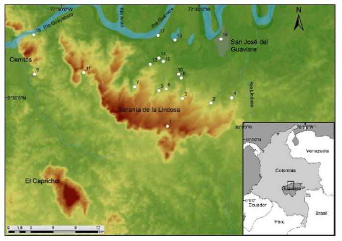 El municipio de San José del Guaviare ocupa la parte norte del departamento del Guaviare, con una extensión de 42327 km2. Presenta un complejo panorama biológico debido a que confluyen allí diferentes provincias biogeográficas y elementos florísticos de la Amazonia, la Orinoquia y la Guayana (Hernández Camacho et al., 1992; Barona-Colmenares et al., 2018). La zona presenta un régimen climático bimodal, con una precipitación promedio anual de 2628 mm y una temperatura promedio de 25.7 °C. La época seca se extiende desde diciembre hasta marzo, con un mínimo de lluvias en enero (30 mm) y un periodo de lluvias desde abril hasta noviembre, con un máximo en junio (560 mm). El muestreo comprendió 18 localidades que corresponden a varios tipos de coberturas vegetales, incluyendo bosques secundarios de galería o de planicie aluvial en cercanía al río Guaviare; bosques de tierra firme adyacentes a afloramientos rocosos, de filiación Amazónica; y herbazales y arbustales sobre afloramientos rocosos del escudo Guayanés (Figura 1; Tabla 1). La descripción de estas coberturas en San José del Guaviare se presenta en Barona-Colmenares et al. (2018).