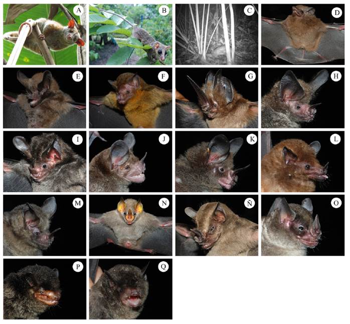 Figura 2: Algunas especies de mamíferos registrados en el municipio de San José del Guaviare, Colombia. A, Caluromys lanatus; B, Marmosa waterhousei; C, Dasypus novemcinctus; D, Peropteryx macrotis; E, Micronycteris megalotis; F, Lampronycteris brachyotis; G, Lonchorhina marinkellei; H, Trachops cirrhosus; I, Tonatia maresi; J, Phylloderma stenops; K, Phyllostomus latifolius; L, Hsunycteris thomasi; M, Glyphonycteris sylvestris; N, Mesophylla macconnelli; Ñ, Platyrrhinus infuscus; O, Sturnira tildae; P, Eptesicus chiriquinus; Q, Myotis keaysi. Fotografías: B, D-Q, Instituto SINCHI; C, Grupo en Conservación y Manejo de Vida Silvestre, Universidad Nacional de Colombia Universidad Nacional de Colombia; A, Wilmer A. Ramírez.