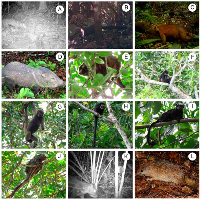 Figura 3: Algunas especies de mamíferos registrados en el municipio de San José del Guaviare, Colombia. A, Leopardus pardalis; B, Eira barbara; C, Nasua nasua; D, Pecari tajacu; E, Aotus vociferans; F, Ateles belzebuth; G, Lagothrix lagothricha; H, Cheracebus lugens; I, Saguinus inustus; J, Coendou prehensilis; K, Cuniculus paca; L, Mesomys hispidus. Fotografías: A, C y L, Instituto SINCHI; B, D y K, Grupo en Conservación y Manejo de Vida Silvestre, Universidad Nacional de Colombia; E-J, Wilmer A. Ramírez.