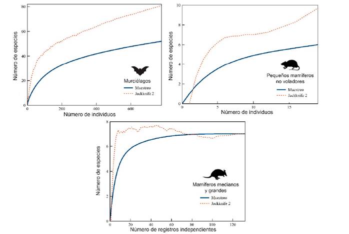 De acuerdo con los valores calculados del estimador Jackknife 2 con base a las capturas en redes de niebla, capturas de trampas Sherman y registros independientes de cámaras trampa, podemos estimar que en la localidad se podrían encontrar alrededor de 81 especies de murciélagos y10 especies de PMNV, mientras que para mamíferos medianos y grandes el inventario está completo (Figura 4).