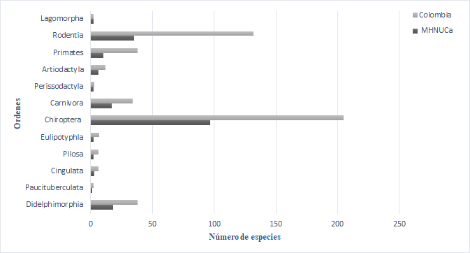 Representatividad de especies por orden presentes en la colección de Mamíferos del Museo de Historia Natural de la Universidad de Caldas, Colombia.