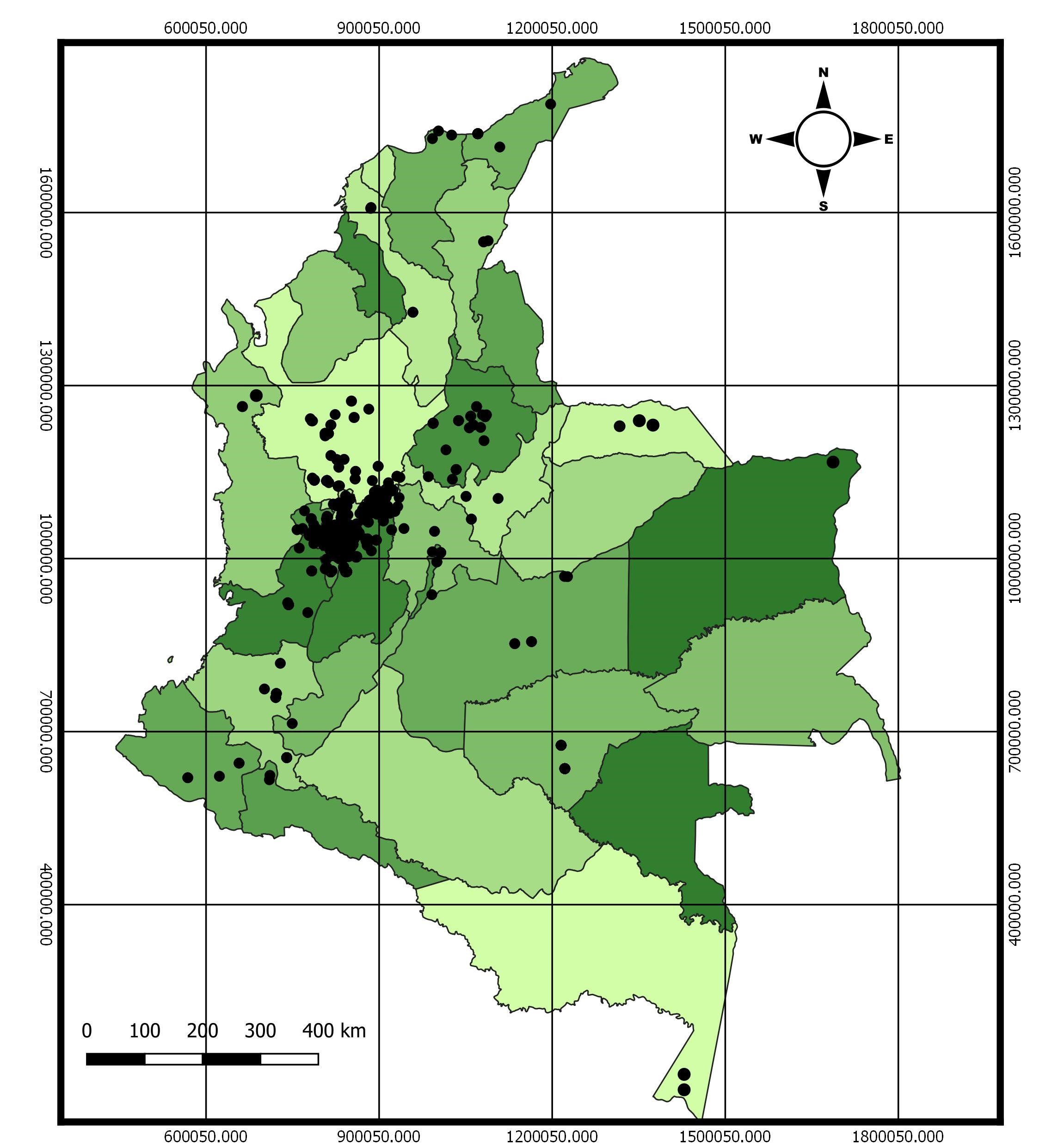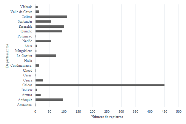 Descripción. Comprende todo el territorio colombiano; existen registros para 21 de los 32 departamentos del país (Figura 2). Los departamentos de Caldas y Tolima presentan el mayor número de registros 1412 y 110, respectivamente. Los departamentos de Atlántico, Boyacá, Caquetá, Casanare, Córdoba, Guainía, Guaviare, Norte de Santander, San Andrés y Providencia, Sucre y Vaupés no registran ningún ejemplar en la colección. Se desconoce la localidad específica de 15 registros.