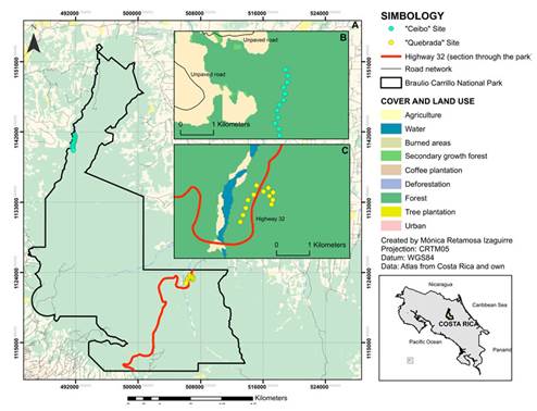 The Braulio Carrillo National Park (BCNP) is one of the most extensive protected areas in central Costa Rica, with 47 689 hectares. It holds approximately 6000 species of plants and thousands of animal species (Boza, 1992). This protected area is crossed by National Highway 32, through which 80 % of the country’s import and export goods are transported (Fernández, 2013). Furthermore, plans exist to expand Highway 32, which might increase vehicular flow through this protected area. Updated information about possible influences of Highway 32 on biodiversity is required to assess present and future impacts, and to support management actions.