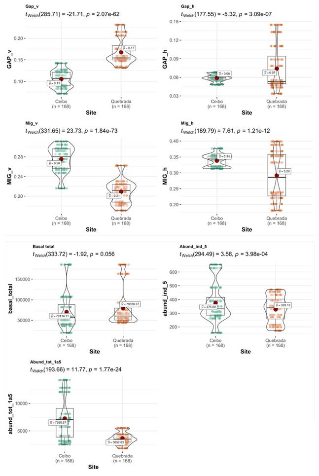 Comparison of variables between sites: Ceibo showed a higher density of trees with a DBH > 5 cm, and shrubs with a DBH of 1-5 cm, and higher complexity of forest structure (higher MIG, both vertically and horizontally). On the contrary, Quebrada showed more open vegetation structure, with larger gaps both vertically and horizontally. However, total basal area was similar at both sites (Figure 2).