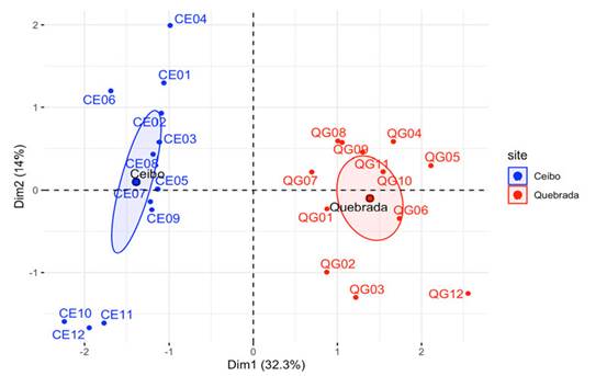 Multivariable description of variability at the study sites: Ceibo and Quebrada sites separated completely in the multiple factor analysis; besides, each of the sampling points clustered around the ellipse that represents the corresponding study site (Figure 5).