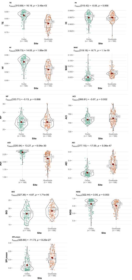 Figure 4: Comparison of acoustic indices between Ceibo and Quebrada sites in the Braulio Carrillo National Park, Costa Rica. Graphic shows Welch test results, 95% confidence interval, p-value (for an alpha value of 0.05) and n.