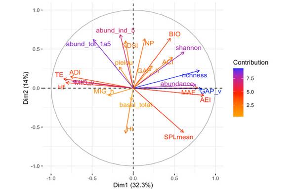 Figure 6: Multiple factor analysis in Ceibo and Quebrada sites of the Braulio Carrillo National Park of Costa Rica, according to three variable groups used (environmental variables, acoustic indices, and bird parameters). The variables with the larger value of contribution (darker color of arrow), contribute the most to the definition of the dimensions. Variables that contribute the most to Dim.1 and Dim.2 are the most important in explaining the variability in the data set.