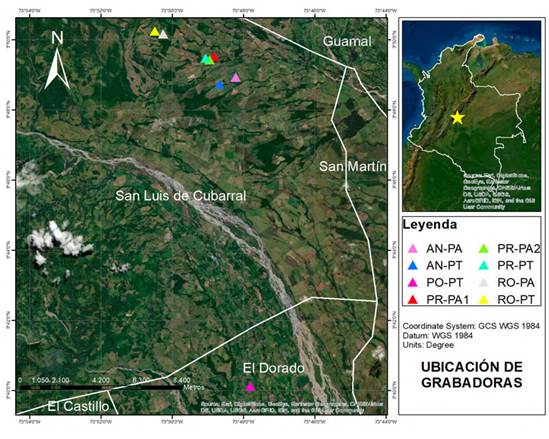 Recientemente se estableció la Red de Ecoacústica Colombiana, que generó el primer reporte de paisajes sonoros para Colombia, con 330 áreas de estudio de monitoreo acústico pasivo. Estas áreas incluyen ecosistemas naturales poco perturbados y transformados (Rodríguez-Buriticá et al., 2018). Sin embargo, para la Orinoquia colombiana no existen estudios de este tipo que permitan describir la biodiversidad desde una dimensión acústica (Rodríguez-Buriticá et al., 2018). En esta región, los procesos de ganadería extensiva y el desarrollo agroindustrial han generado cambios en los usos del suelo (Romero-Ruiz et al., 2012), lo cual se ha acelerado en el nuevo escenario de postacuerdo, sumado a la alta presión de desarrollo agroindustrial (Williams et al., 2020). Esta transformación es evidente especialmente en el departamento del Meta, donde la tasa de deforestación en 2018 fue una de las más altas en el país, principalmente asociada a actividades agrícolas a gran escala, como ganadería extensiva y cultivos ilícitos (IDEAM, 2019). Bajo este desalentador escenario, una de las estrategias de conservación que se ha venido impulsando a través del proyecto Ganadería Colombiana Sostenible es la implementación de sistemas silvopastoriles como sistemas productivos que promueven la diversidad biológica en zonas ganaderas y agrícolas homogéneas (Murgueitio et al., 2013), al generar pequeñas manchas aisladas de vegetación y corredores de hábitat heterogéneos (Naranjo, 1992).