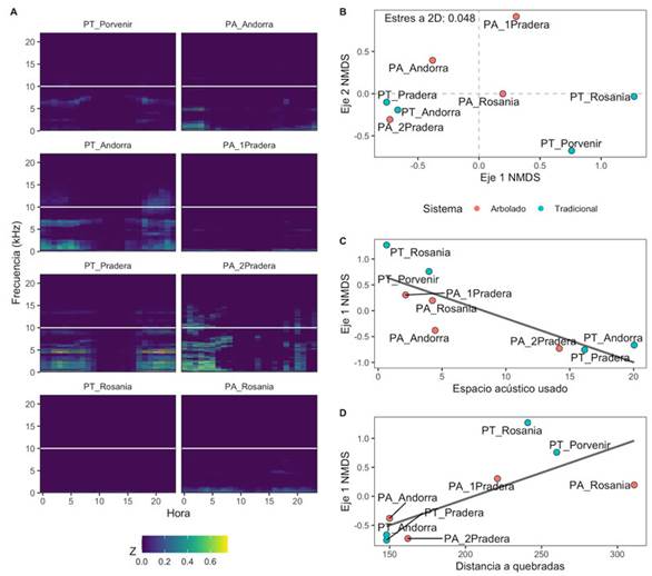 Al comparar los paisajes sonoros de los diferentes sitios por medio del NMDS (Figura 2B), el cual tuvo un valor de estrés de 0.048 con dos dimensiones (Figura S1), se observó que tanto los sistemas de potreros arbolados como los potreros tradicionales parecen distanciarse en el eje 2, con los potreros arbolados hacia valores positivos y potreros tradicionales hacia valores negativos, aunque la dispersión entre ellos no varió significativamente (F1,6 = 0.630, P = 0.46). Aunque los sitios se ven aparentemente muy cercanos (promedio distancia 900 m, rango 241-15 963 m), la distancia a la grabadora más cercana no se correlaciona con ninguno de los ejes del NMSD, es decir que la ordenación es independiente de la distribución espacial de los sitios. El análisis de varianza (ANDEVA) mostró una variación que estuvo significativamente relacionada con el espacio acústico usado (Figura 2C; F1,7 = 2.784, P = 0.02) y con la distancia a quebradas (Figura 2D; F1,7 = 2.092, P = 0.05).