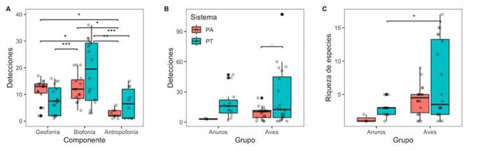 Figura 3. Variación del paisaje sonoro en potreros arbolados (PA) y potreros tradicionales (PT) en el departamento del Meta, Colombia. A, detecciones de componentes del paisaje sonoro (geofonía, biofonía o antropofonía); B, detecciones de anuros y aves; C, número de especies de anuros y aves reportadas por hora y sitio para sistemas silvopastoriles. Diagrama de cajas representa la mediana y el rango intercuartílico (IQR; 50 % de los datos), el bigote (línea vertical) se extiende +1.5 veces el IQR. Las líneas horizontales vinculan grupos significativamente diferentes (significancia: [.], P > 0.1; [*], P > 0.05; [**], P > 0.01; [***], P > 0.001)
