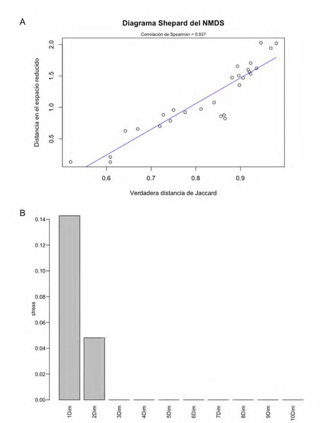 Para comparar los paisajes sonoros, se realizó una ordenación no métrica multidimensional escalonada (NMDS) a partir de las celdas que arrojaron más información en alguno de los sitios (sumatoria de proporciones de grabaciones entre los sitios >1). Dichas celdas (806) incluyeron actividad acústica concentrada principalmente en frecuencias del espectro audible por debajo de los 10 kHz, rango de frecuencia que incluye la mayoría de los sonidos de aves y anfibios (Aide et al., 2017); por eso centramos los análisis para la ordenación solo en esa franja de frecuencia audible (0-10 kHz). La ordenación se corrió usando la distancia de disimilitud Jaccard, al ser datos de incidencia, con 20 permutaciones y a partir del uso de la función metaMDS. La matriz usada para correr la ordenación también sirvió para comparar los paisajes sonoros y relacionarlos con diferentes covariables ambientales, a partir de un análisis de varianza (ANDEVA) multivariado, con la función adonis, usando 999 permutaciones. Finalmente, comparamos la dispersión de los puntos de cada sistema con la función betadisper. Las tres funciones mencionadas pertenecen al paquete vegan en R (Oksanen et al., 2019).