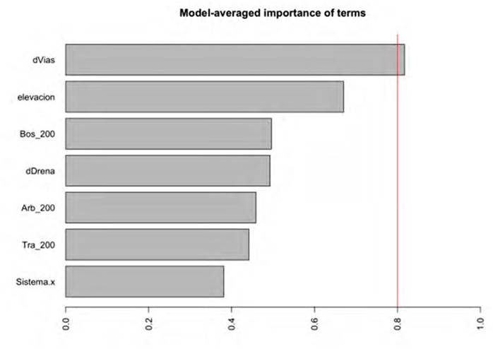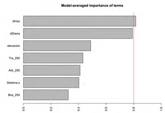 Covariables ambientales. Para evaluar el efecto en el paisaje sonoro, se definieron covariables ambientales a  partir de la imágen del satélite Sentinel-2 del 25 de diciembre de 2018 (Dymond et al., 2002; Samarawickrama et al., 2017), que permite una resolución entre 10 y 20 m (Vrieling et al., 2018). Se calculó el porcentaje de bosque natural (incluso secundario), potrero arbolado y potrero tradicional en radios de 50, 100 y 200 m (Información Suplementaria y Tabla S1). Aunque las variables de porcentaje de bosque natural, potrero arbolado y potrero tradicional a diferentes radios estuvieron altamente correlacionadas, para las comparaciones se usaron solo los valores a un radio de 200 m. Así mismo, se estimaron las distancias a vías y quebradas. Estas covariables ambientales fueron usadas para una escogencia múltiple de modelos lineales generalizados que pudieran explicar las variables respuesta, para lo cual fueron estandarizadas (i.e., reescalonadas para tener como promedio 0). Se usó la función glmulti del paquete glmulti para generar automáticamente todos los posibles modelos. Para determinar el modelo más factible o mejor ajustado se usó el criterio de información de Akaike (AICc), considerando un DAICc < 2 para los modelos más robustos (Burnham & Anderson, 2004).