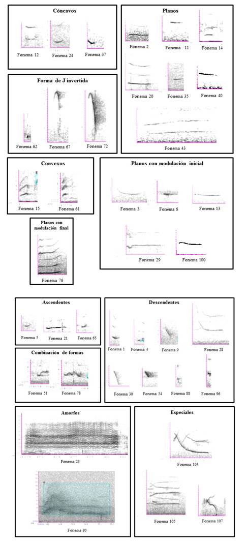 Aunque con base en estas variables identificamos 107 fonemas, para este análisis descartamos 31 fonemas con menos de 10 datos ya que el intervalo de confianza resultante fue demasiado amplio. Algunos fonemas son iguales entre sí y en este caso los consideramos como uno sólo. Por lo tanto, el repertorio vocal de este primate tuvo aproximadamente entre 49 y 80 unidades fonéticas, que se agruparon en 11 formas fonéticas. La descripción de los grupos fonéticos se presenta en la Tabla 1 y se ilustran en la Figura 1.