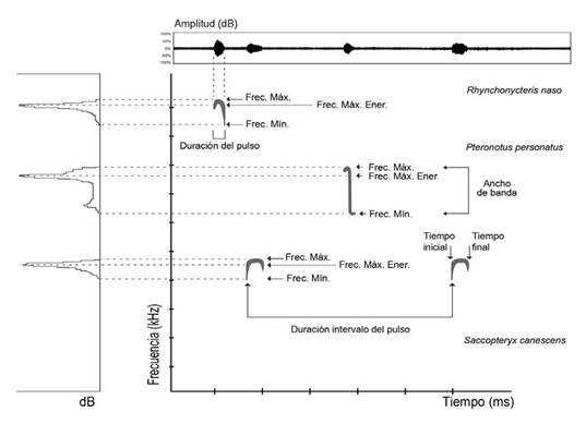 En el Anexo 1 se definen y señalan (*) los parámetros básicos que se deben extraer y medir de las señales de ecolocalización de los murciélagos, para generar una descripción confiable del comportamiento de ecolocalización de una especie.