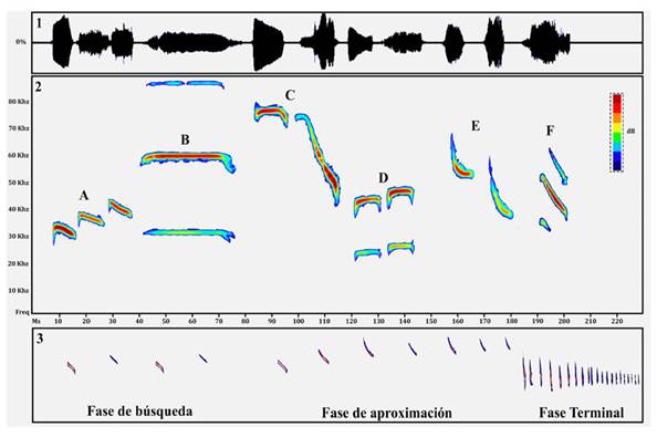 Señales de ecolocalización y su análisis. Las señales de ecolocalización emitidas por los murciélagos son moldeadas por diversas fuentes de variación, como la historia evolutiva, los mecanismos de procesamiento de la información y las necesidades sensoriales impuestas por el tipo de hábitat, la estrategia de búsqueda de alimento y la dieta (Schnitzler et al., 1994; Siemers et al., 2001). Adicionalmente, el comportamiento de ecolocalización puede dividirse generalmente en tres fases, indistintamente de la especie en cuestión: cuando un murciélago insectívoro aéreo busca alimento (fase de búsqueda), cuando localiza la presa y se aproxima a ella (fase de aproximación) y, finalmente, cuando el murciélago intenta capturar la presa, se da la emisión de la fase terminal o “feeding buzz” (Anexo 1; Schnitzler & Kalko, 2001; Russ, 2012). Las señales emitidas en la fase de búsqueda son relativamente uniformes, presentando poca variabilidad en rasgos espectrales o temporales, mientras que en las fases de acercamiento o fase terminal ocurren cambios en dichos rasgos (Obrist, 1995; Schnitzler & Kalko, 2001). Por esta razón, se recomienda hacer las mediciones correspondientes para identificar las especies en la fase de búsqueda (O’Farrell & Miller, 1999).