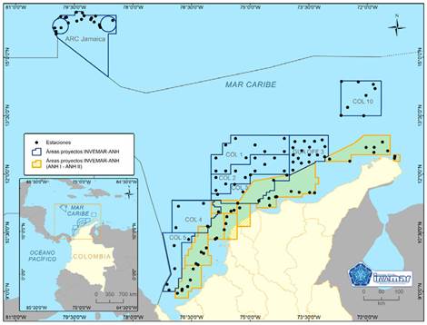 Los proyectos INVEMAR-ANH que registraron valores de abundancia (GUA OFF 3, COL 1 y COL 2 T1, COL 3 y COL 10), registraron en total 185 estaciones y geográficamente están ubicadas en el sector nororiental, con excepción de las estaciones E467 del bloque COL 1, E433, E431 y E428 del bloque COL 2 y E570, E557 del bloque COL 3, ubicadas en el sector suroriental.