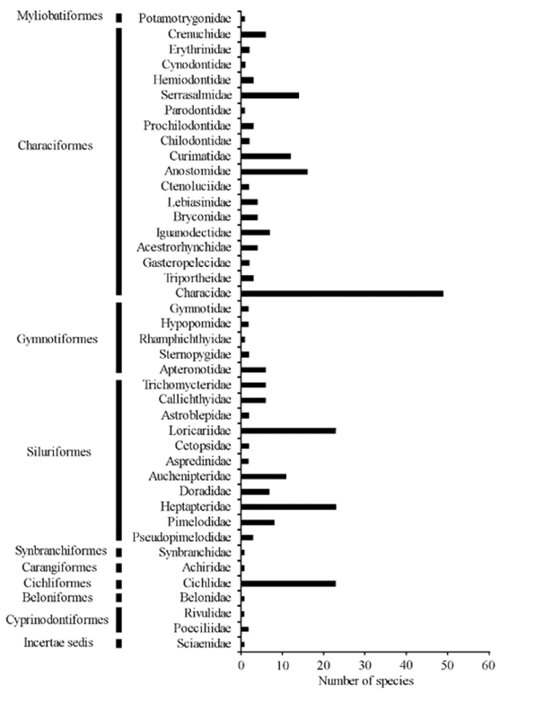Family. Acestrorhynchidae, Achiridae, Anostomidae, Apteronotidae, Aspredinidae, Astroblepidae, Auchenipteridae, Belonidae, Bryconidae, Callichthyidae, Cetopsidae, Chalceidae, Characidae, Chilodontidae, Cichlidae, Crenuchidae, Ctenoluciidae, Curimatidae, Doradidae, Erythrinidae, Gasteropelecidae, Gymnotidae, Hemiodontidae, Heptapteridae, Hypopomidae, Iguanodectidae, Lebiasinidae, Loricariidae, Parodontidae, Pimelodidae, Poeciliidae, Potamotrygonidae, Prochilodontidae, Pseudopimelodidae, Rhamphichthyidae, Rivulidae, Sciaenidae, Serrasalmidae, Sternopygidae, Synbranchidae, Trichomycteridae, Triportheidae.