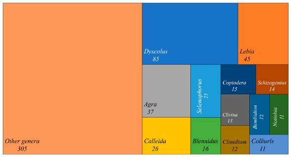 Figure 1: Number and proportion of species by genus of ground beetles recorded from Colombia