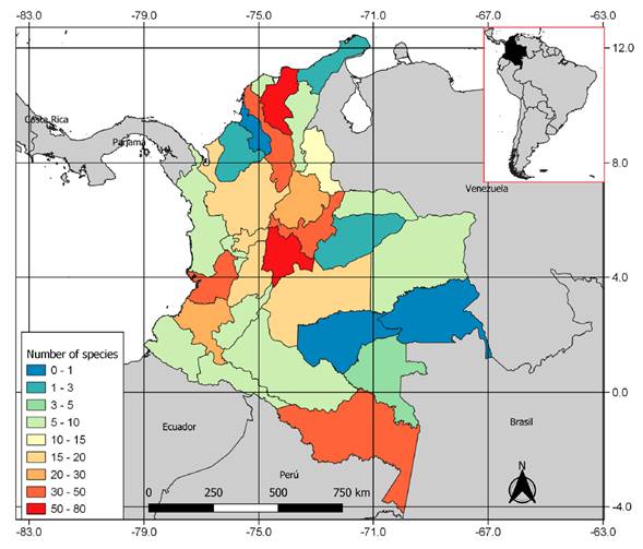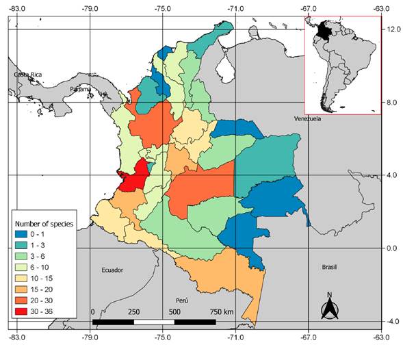 Figure 5: Distribution of tiger beetle species in Colombia, per departments.
