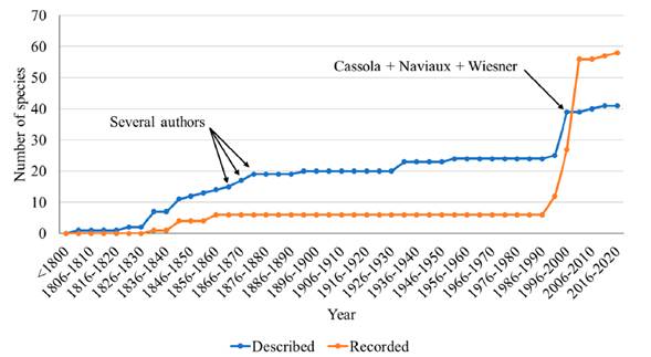 Figure 8: Cumulative number of tiger beetle species described from Colombia (in blue) and recorded from Colombia (in orange), in five-year increments, up to 2020. Species described from Colombia but subsequently synonymized are not included.