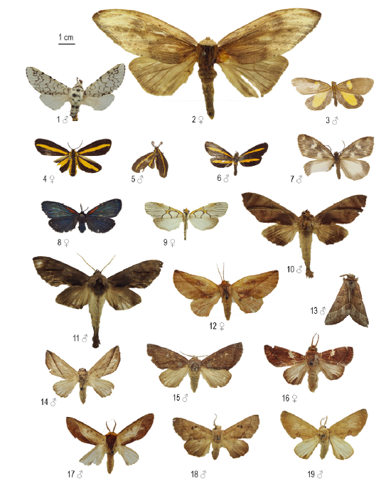 Figuras 1-19: Cerurinae, Dicranurinae, Dioptinae, Dudusinae y Hemiceratinae de la Colección Taxonómica Nacional de Insectos “Luis María Murillo” (CTNI), Cundinamarca, Colombia. Escala: 1 cm. 1, Tecmessa rarata; 2, Truncaptera elongata; 3, Hadesina divisa; 4, Josia gigantea; 5, Lyces annulata; 6, Polypoetes eriphus; 7, Polypoetes ineldo; 8, Scea necyria; 9, Scotura annulata; 10, Crinodes huebneri; 11, Crinodes wobani; 12, Apela aff. divisa; 13, Hemiceras beata; 14, Hemiceras aff. colombia; 15, Hemiceras constellata; 16, Hemiceras gortynoides; 17, Hemiceras longipennis; 18, Hemiceras modesta; 19, Hemiceras oleaginea.