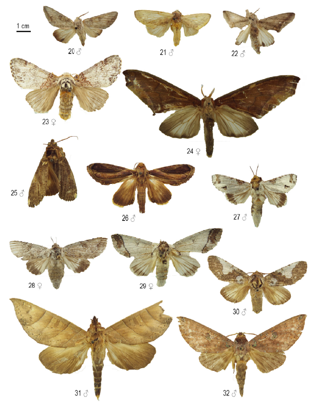 Figuras 20-32: Hemiceratinae y Heterocampinae de la Colección Taxonómica Nacional de Insectos “Luis María Murillo” (CTNI), Cundinamarca, Colombia. Escala: 1 cm. 20, Hemiceras aff. opaca; 21, Hemiceras pallidula; 22, Hemiceras sabis; 23, Boleza amazonica; 24, Colax apulus; 25, Disphragis onerosa; 26, Draudtargia merita; 27, Ginaldia arecosa; 28, Ginaldia dissepta; 29, Ginaldia lineata; 30, Goodgeria apella; 31, Hapigia denhezi; 32, Hapigia repandens.