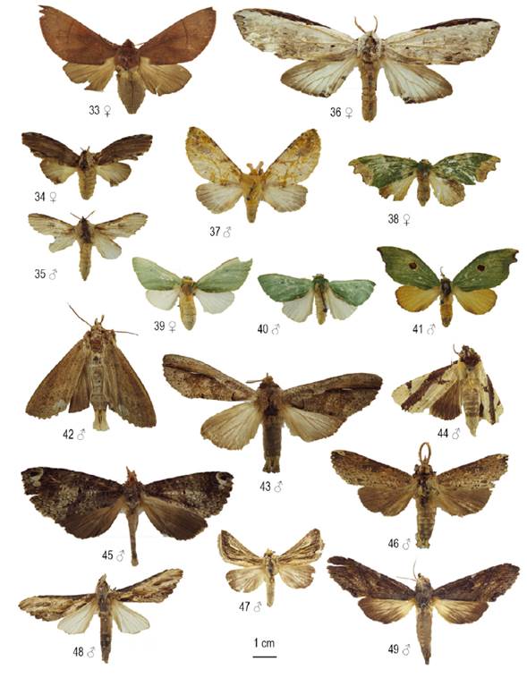Figuras 33-49: Heterocampinae y Nystaleinae de la Colección Taxonómica Nacional de Insectos “Luis María Murillo” (CTNI), Cundinamarca, Colombia. Escala: 1 cm. 33, Hapigia simplex; 34-35, Ianassa drucei; 36, Lirimiris lignitecta; 37, Psilacron luteovirens; 38, Rosema apicalis; 39, Rosema lappa; 40, Rosema milleri; 41, Rosema tinae; 42, Bardaxima donatian; 43, Bardaxima ionia; 44, Calledema contingata; 45, Elasmia perses; 46, Elasmia astuta; 47, Lepasta bractea; 48, Nycterotis sirena; 49, Nystalea squamosa.